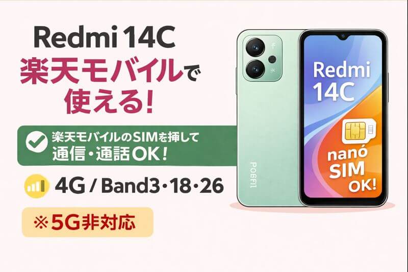 結論から言うと、Redmi 14Cは楽天モバイルで利用可能です。楽天モバイルの自社回線である4G Band 3に対応しているため、楽天回線エリア内であれば問題なく通信できます。ただし、万人向けではなく、使い方や利用エリアによっては注意点もある端末です。